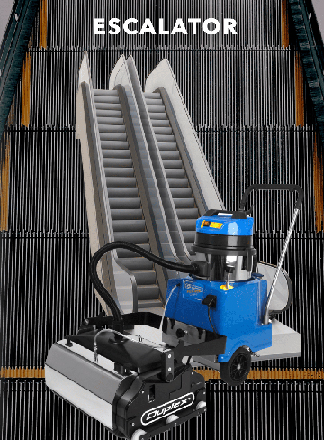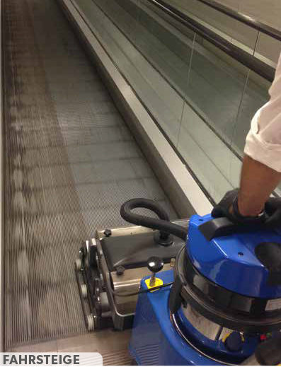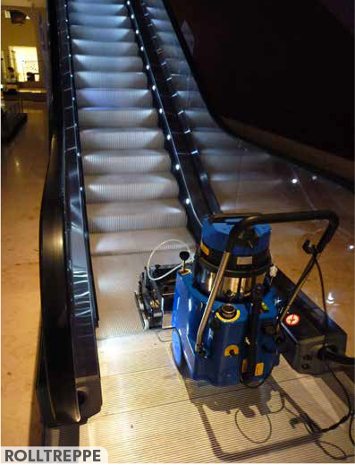 Die Duplex-Maschinen für die tiefgreifenden Reinigung von Rolltreppen und Fahrsteigen entfernen den in den Rillen abgelagerten Schmutz.
